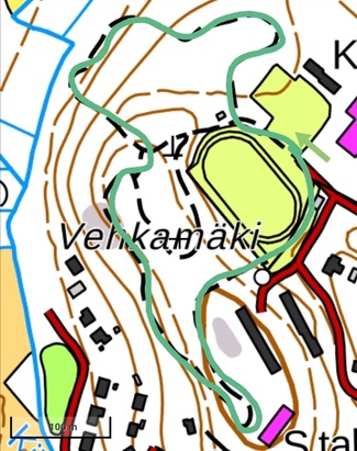 Lähtö parkkialueelta kohti urheilukentän perällä olevaa varastorakennusta. Ennen rakennusta käännytään oikealla. Paikalla opasteet (4km / 10km).